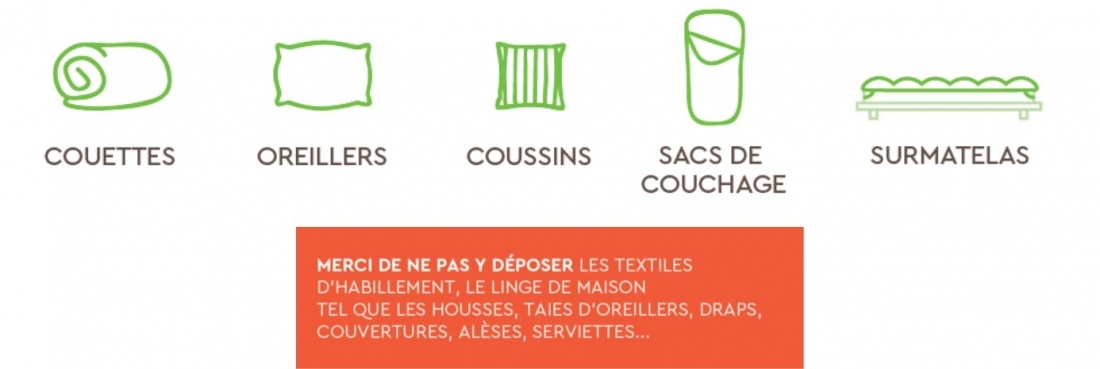 Vous pouvez déposer les couettes, oreillers, coussins, sacs de couchage et surmatelas hors d’usage quel que soit l’état (abîmé, déchiré...), dans des sacs prévus à cet effet. Une fois pleins, l’agent de déchèterie se chargera de les mettre dans la benne meubles.