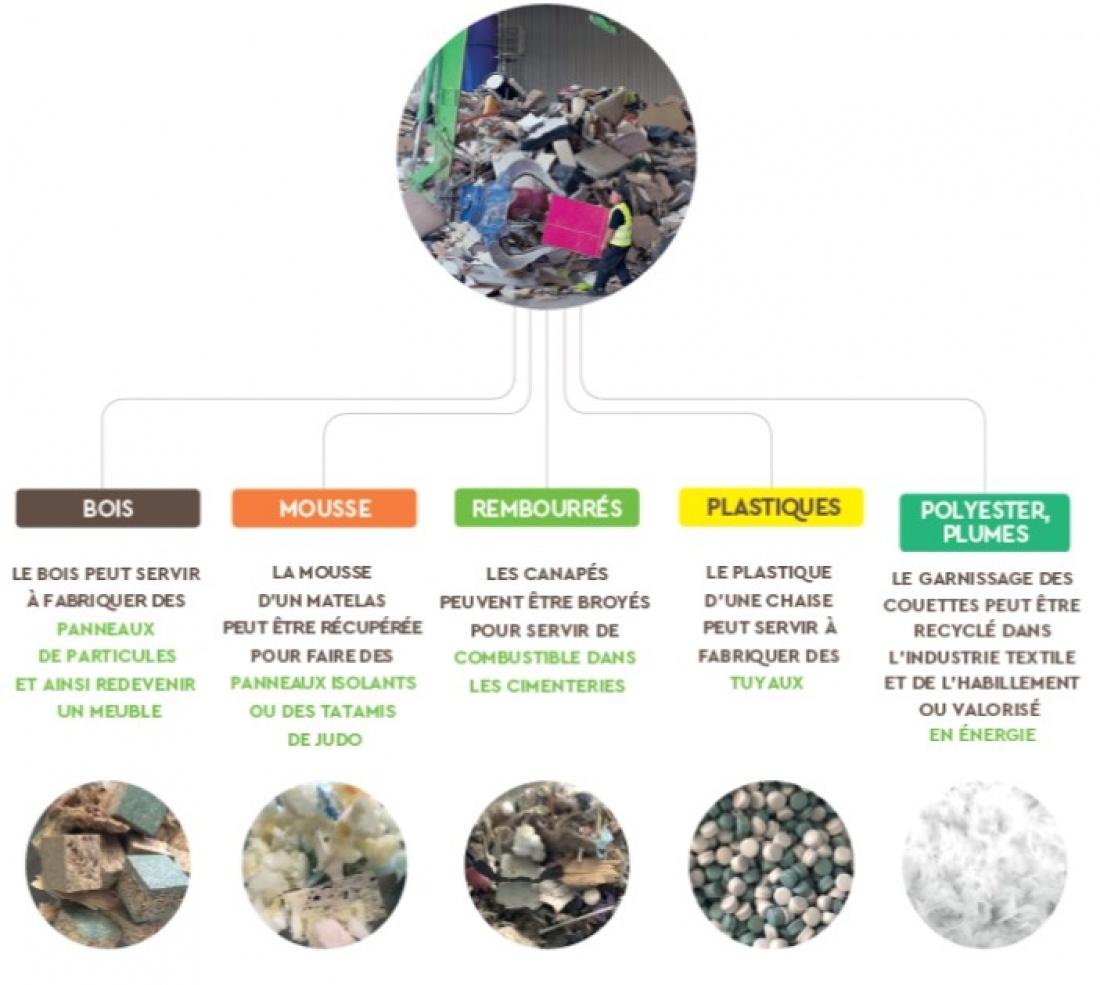 Eco-mobilier, éco-organisme à but non lucratif, agréé par l’Etat, financé par l’éco-participation payée lors de l’achat des meubles neufs, prend en charge la collecte, le tri et le recyclage des meubles, matelas, couettes et oreillers usagers.
