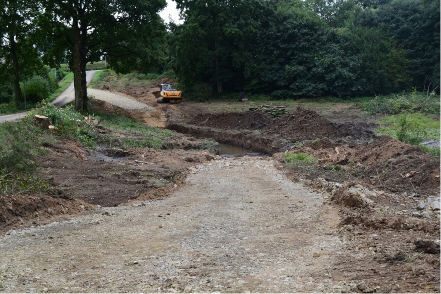 Compte tenu de la dangerosité du site (effondrement d'une partie de la digue suite aux fortes pluies de mai 2020), il a fallu intervenir dans les meilleurs délais tout en associant de multiples partenaires et en premier lieu les propriétaires,exploitants et riverains du site.La première étape a été la caractérisation précise du site afin de bien comprendre le fonctionnement du cours d'eau dans cet ancien étang asséché depuis 1946. Les connaissances des riverains auront permis de compléter utilement les approches plus techniques menées par le bureau d'études SARL RIVE qui est en charge du suivi des travaux. Le choix final s'est porté sur le remplacement de l'ouvrage historique par un pont-cadre d'une largeur de 2.5 m, d'une longueur de 18 m et d'une hauteur de 2.5 m; ainsi que la remise en fond de vallée du ruisseau sur environ 240m dans l'emprise de l'ancien étang. Cet imposant ouvrage permettra de supporter le passage d'engins agricoles en toute sécurité et assurera la bonne circulation des sédiments et de la faune aquatique.