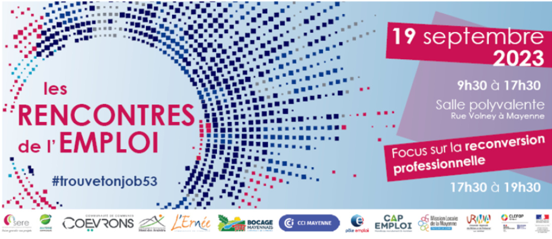 Vous cherchez un emploi ? un stage ? une alternance ? ou vous souhaitez vous réorienter professionnellement, participez aux Rencontres de l'Emploi du mardi 19 septembre à la Salle Polyvalente de Mayenne.