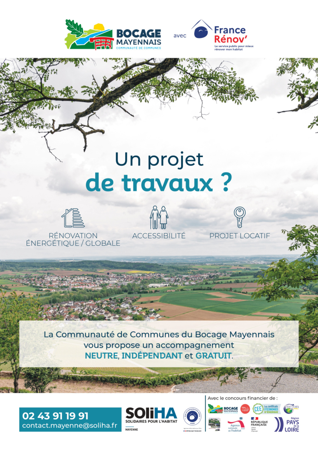 Contactez-les au 07 77 96 32 84 (du lundi au vendredi de 9h à 12h et de 13h30 à 17h30) ou par mail francerenov-bocage.mayennais@soliha.fr .