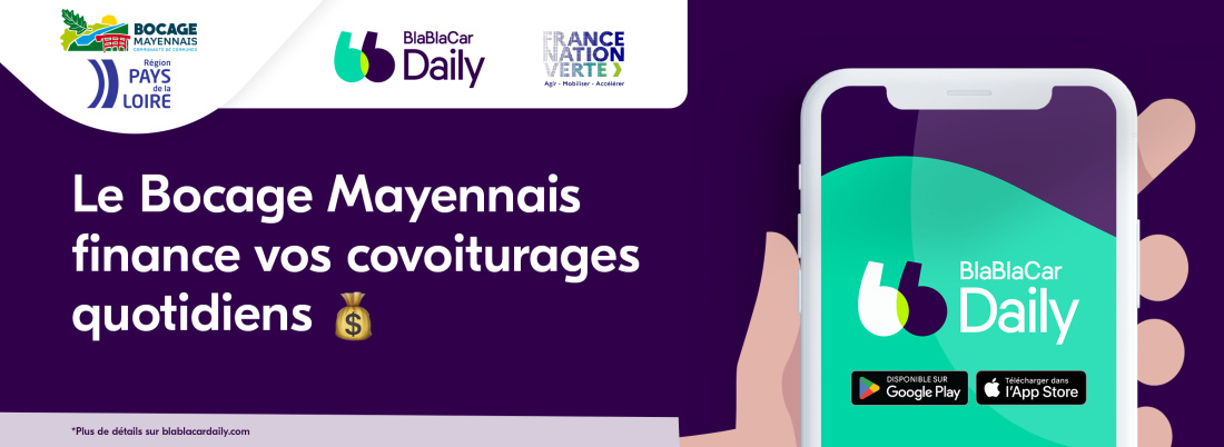 La Loi d’Orientation des Mobilités (LOM) dont les derniers décrets covoiturage ont été publiés en juin 2020, permet aux collectivités locales de subventionner les trajets en covoiturage au même titre que le transport public, avec pour objectif de tripler la part du covoiturage dans les trajets quotidiens en 5 ans. La Communauté de Communes du Bocage Mayennais a décidé de s’engager aux côtés de la Région Pays de la Loire dans le financement de ce nouveau dispositif avec Klaxit (devenu BlaBlaCar Daily depuis le 11 mars 2024) pour l’ensemble des habitants du territoire.