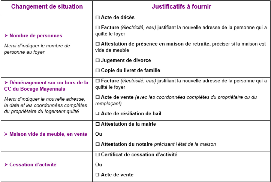Tout changement de situation intervenu en cours d’année (nombre de personnes au foyer, déménagement, cessation d'activité...) doit être signalé :
