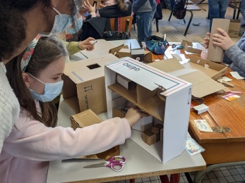 Pour susciter un lien artistique entre les 4 classes, les matériaux ont été échangés. Ainsi une classe travaillait le carton en musique, et le bois en arts visuels. Une autre a réalisé une musique avec le minéral, et des oeuvres plastiques avec... du plastique !