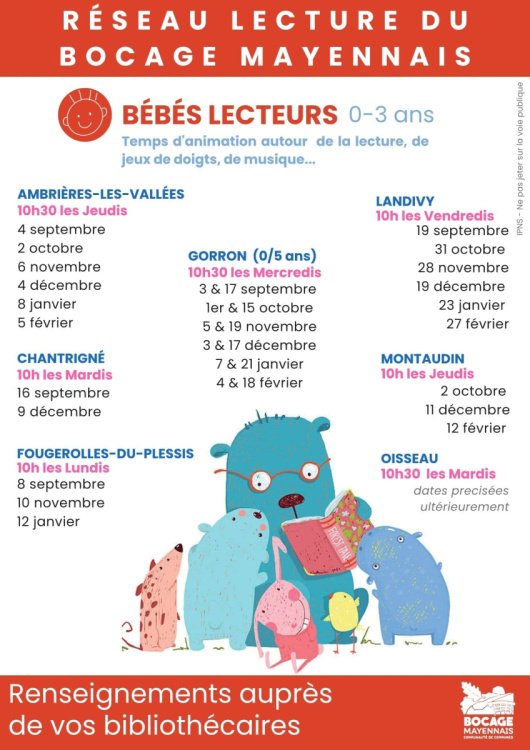 Les séances "Bébés lecteurs" sont ouvertes aux enfants de 0 à 3 ans (ou 5 ans sur la médiathèque de Gorron), accompagnés d’une assistante maternelle, d’un parent, d’un grand-parent… Ce sont des moments priviligiés et conviviaux autour de la lecture, des histoires, des jeux de doigts, des comptines où les petits écoutent, regardent, touchent.