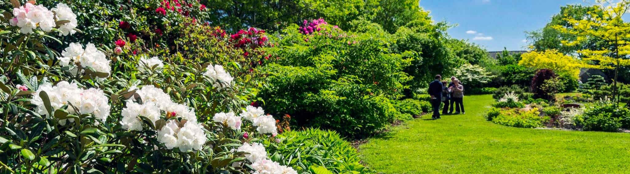 Les 21 massifs forment un parc de 4 hectares où foisonnent plus de 3000 variétés de plantes à fleurs, arbres et arbustes. Les amateurs y sont bien entendu les bienvenus ; de nombreux végétaux rares composent ce jardin botanique. Parmi les collections, on dénombre 400 rhododendrons et azalées, 350 hydrangeas, 133 variétés de rosiers, 70 variétés de camellias, 50 variétés d’hostas, plus de 500 vivaces … Les effets de perspectives sont assurés par l’étagement des plantations. La roue et son bassin participent plaisamment au cadre reposant des jardins.