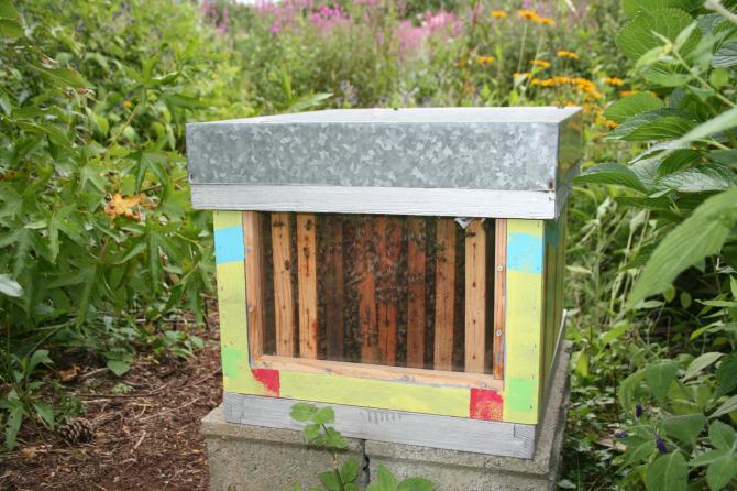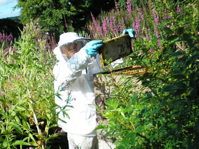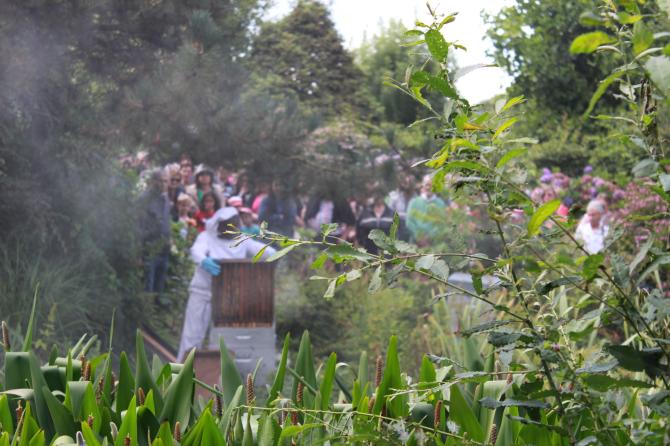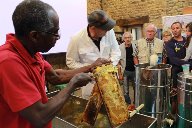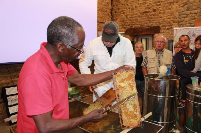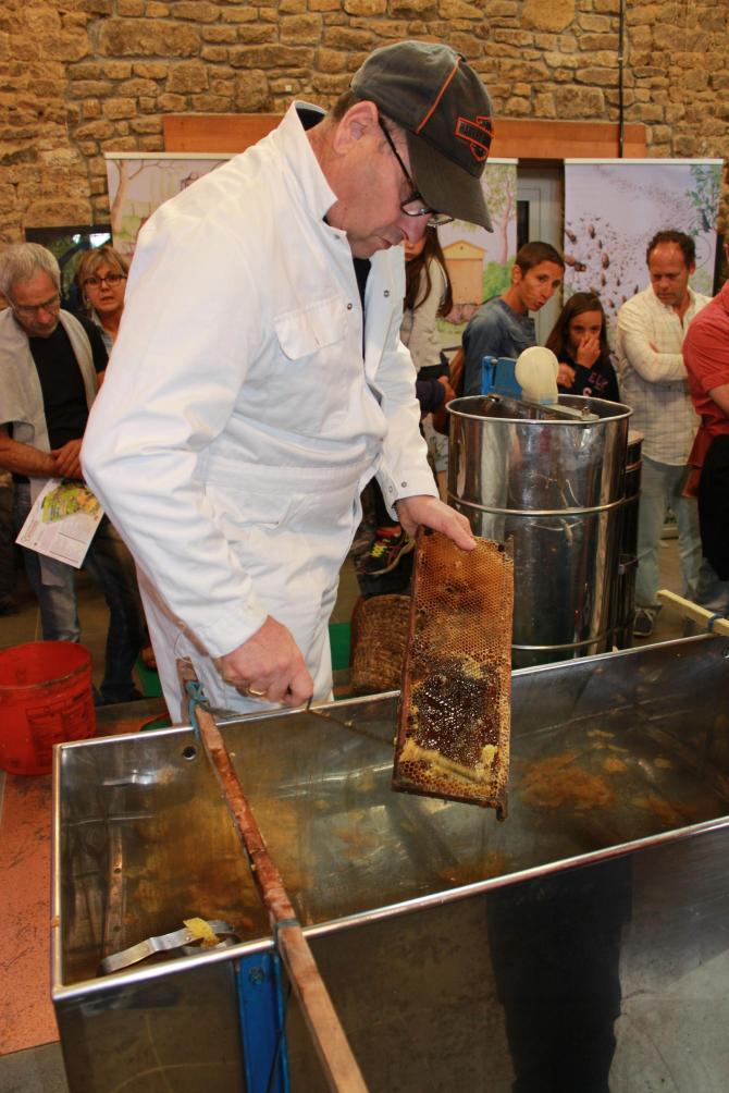 Extraction du miel des Jardins devant le public, avec Ange BIGOT, producteur-récoltant local.