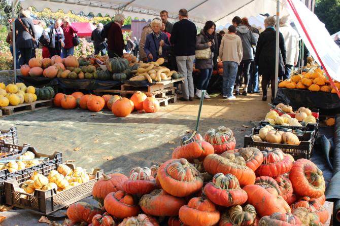 Événement phare et haut en couleurs de la saison pour les Jardins. : marché de citrouilles et autres courges. Les 80 variétés sont cultivées ici par nos jardiniers. Décos de citrouilles dans le parc.