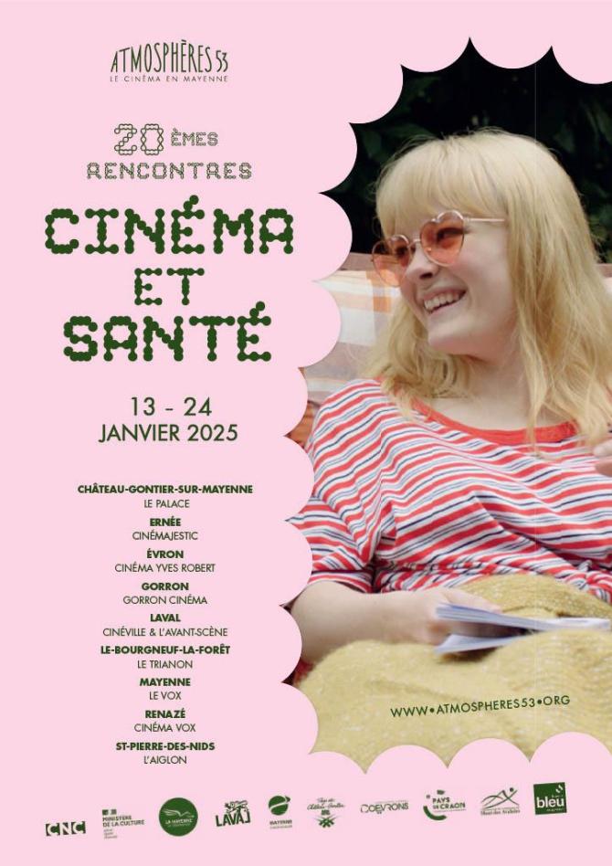 Atmosphères 53 vous propose 12 séances dans 10 cinémas de la Mayenne. Comme chaque année, nous aborderons des thèmes chers aux yeux du comité de pilotage, parce que nous estimons qu’il est essentiel d’en parler ensemble, parce que nous sommes attaché.es aux problématiques contemporaines de santé et que le cinéma est un vecteur formidable et populaire pour échanger avec les publics. Comme à l’accoutumée, toutes les séances bénéficieront d’invité.es, issu.es du cinéma et de la santé, invité.es qui viendront nous éclairer de leur savoir et pourront débattre avec les spectateurs.trices présent.es.