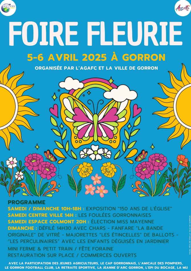 Samedi 5 et dimanche 6 avril, Gorron est à la fête avec la traditionnelle FOIRE FLEURIE! Au programme :