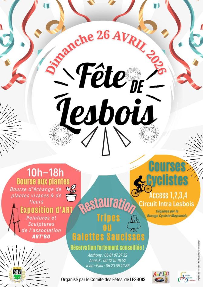 Lesbois vous invite à sa fête communale annuelle pour partager des moments de convivialité autour d'un bon repas, échanger autour de la bourse aux plantes, admirer les œuvres de l'exposition d'Art Bo et encourager les sportifs des courses cyclistes !